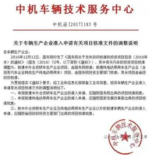 中機中心發(fā)布《關(guān)于車輛生產(chǎn)企業(yè)準(zhǔn)入申請有關(guān)項目核準(zhǔn)文件的調(diào)整說明》,為貫徹落實《國務(wù)院關(guān)于發(fā)布政府核準(zhǔn)的投資項目目錄(2016年本)的通知》的要求,將車輛生產(chǎn)企業(yè)準(zhǔn)入申請有關(guān)項目核準(zhǔn)文件作了調(diào)整說明。其中,除中外合資轎車生產(chǎn)企業(yè)及純電動乘用車生產(chǎn)企業(yè)以外的新建車輛生產(chǎn)企業(yè)的準(zhǔn)入申請(這里面包括新建商用車、專用車生產(chǎn)準(zhǔn)入申請)由省級政府核準(zhǔn),應(yīng)隨附省級政府投資主管部門出具的項目核準(zhǔn)批復(fù)。