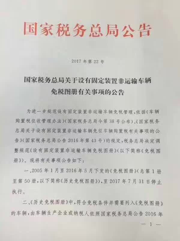 關(guān)于之前一直眾說紛紜的,環(huán)衛(wèi)車將2017年7月1日專用車取消免稅說法,現(xiàn)在國家稅務(wù)總局的正式文件已經(jīng)下發(fā), 已證實(shí), 并不是取消專用車免稅政策, 只是從7月1日起更換免稅圖冊(cè), 新的免稅圖冊(cè)沒有下來之前不能辦理免稅 ,所以請(qǐng)需要購新車的客戶提前訂車, 避免造車麻煩 ,環(huán)衛(wèi)車購置稅免征情況說明1、《歷史免稅圖冊(cè)》(2005年1月-2016年5月下發(fā)的《免稅圖冊(cè)》)將于2017年7月31日停止執(zhí)行。2、《歷史免稅圖冊(cè)》中的免征車型由車輛生產(chǎn)企業(yè)于2017年6月30日前重新提交相關(guān)信息與資料進(jìn)行審核,更新《免稅圖冊(cè)》。原文如下: