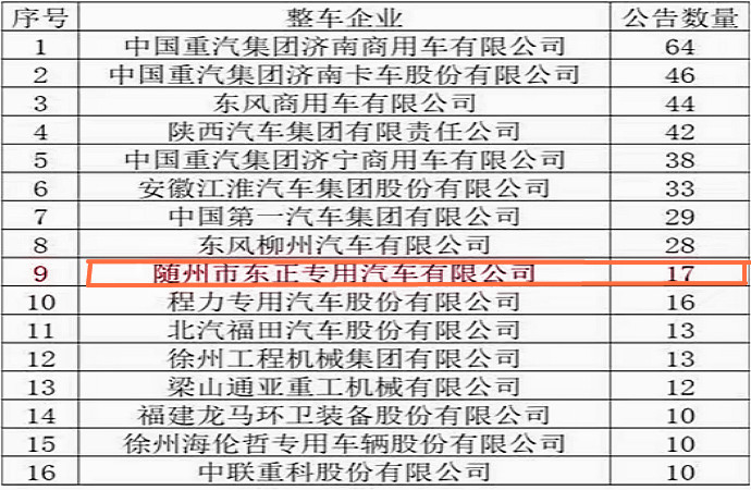 對于整車公告而言,本批國六重卡公告數(shù)量10個以上的企業(yè),共計(jì)16家,主機(jī)廠占據(jù)主流,重汽濟(jì)南商用車、重汽濟(jì)南卡車東風(fēng)商用車公司分列前三名。改裝廠中,隨州東正汽車排名靠前。