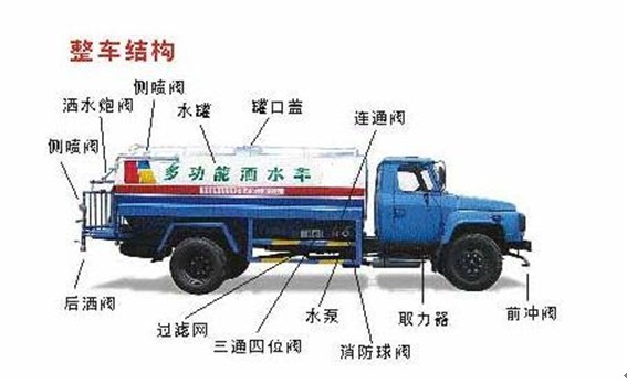 我國(guó)大部分地區(qū)灑水車主要配置;前沖(噴)后灑,帶側(cè)噴,罐體后帶工作平臺(tái),平臺(tái)上安裝綠化灑水炮,灑水炮可全方位旋轉(zhuǎn),可連續(xù)調(diào)成直沖狀、大雨、小雨、毛毛雨,帶安全護(hù)欄,配備大功率專用灑水泵,泵可自吸自排,安裝過濾網(wǎng),帶消防接口,可通過消防栓進(jìn)水,帶自流閥。