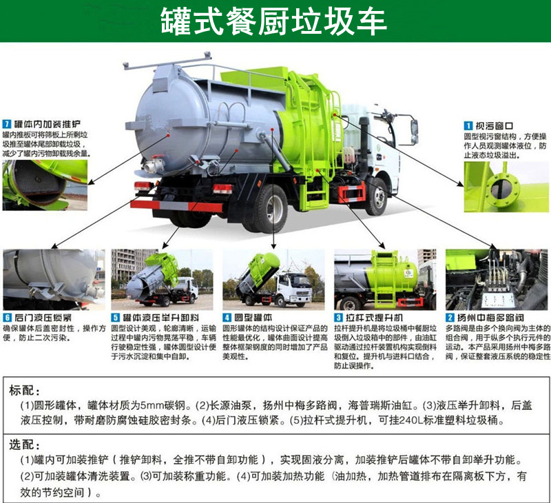 方罐式餐廚垃圾車(chē):弧形廂體,箱體內(nèi)可實(shí)現(xiàn)固液分離,推鏟卸料,后蓋液壓開(kāi)啟/鎖緊(帶耐磨橡膠密封條密封-后門(mén)關(guān)閉后滴水不漏),后門(mén)液壓鎖緊防誤操作功能,掛桶式提升機(jī),可配合120升、240升標(biāo)準(zhǔn)垃圾桶使用,清洗裝置(帶水箱、液壓馬達(dá)帶動(dòng)高壓泵)。