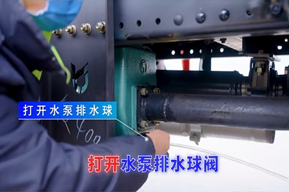 三、打開水泵排水球閥,排盡泵內(nèi)余水,防止水泵凍裂,再次使用前須注入引水。